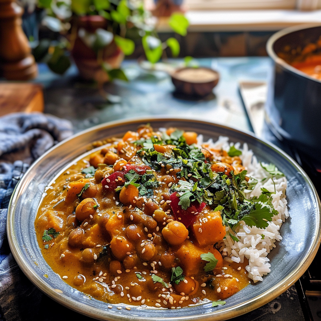 Cozy Sweet Potato Lentil Curry with Crispy Chickpeas