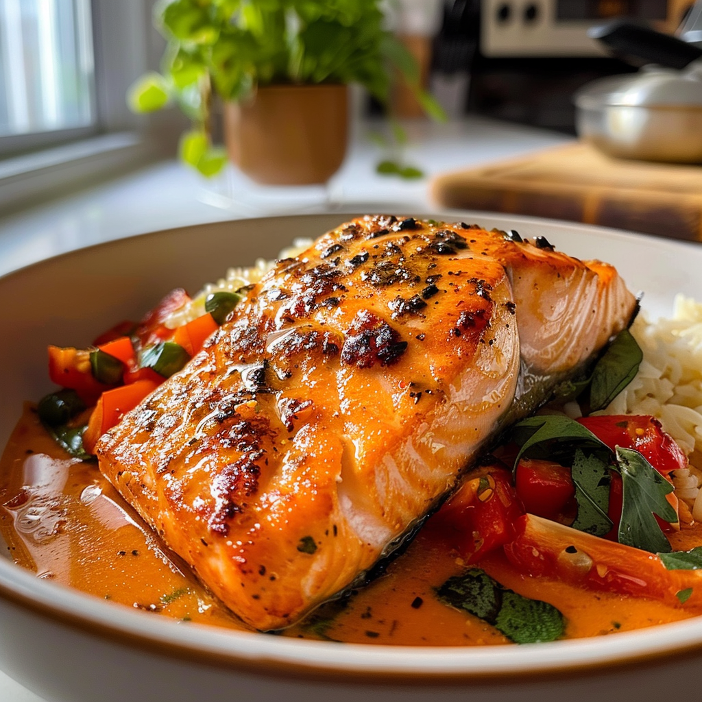 Indulge in creamy roasted red pepper salmon—a dish that brings together tender salmon fillets and a luscious, velvety sauce made from roasted red peppers and garlic. This quick yet elegant recipe is perfect for busy weeknights or special gatherings. Serve it alongside rice or a fresh salad for a meal that’s as visually stunning as it is delicious.