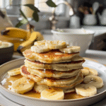 Serve Warm & Enjoy!: Stack the pancakes high on plates and serve immediately with banana slices and maple syrup drizzled generously on top!