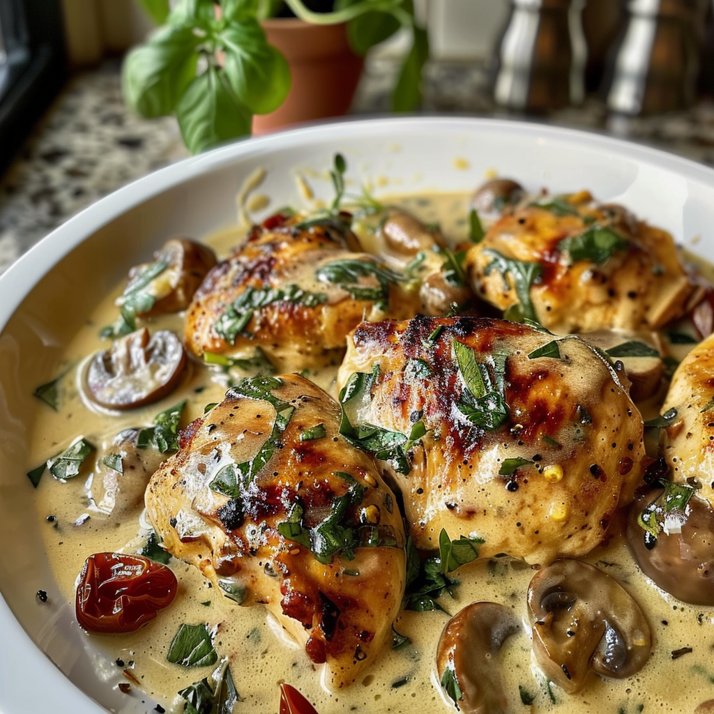 Creamy Mushroom Chicken with Sun-Dried Tomatoes and Olives