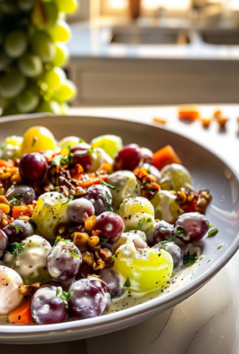 To whip up this easy grape salad efficiently, start by washing the grapes thoroughly while you prepare your dressing. This ensures every bite is fresh and delicious.